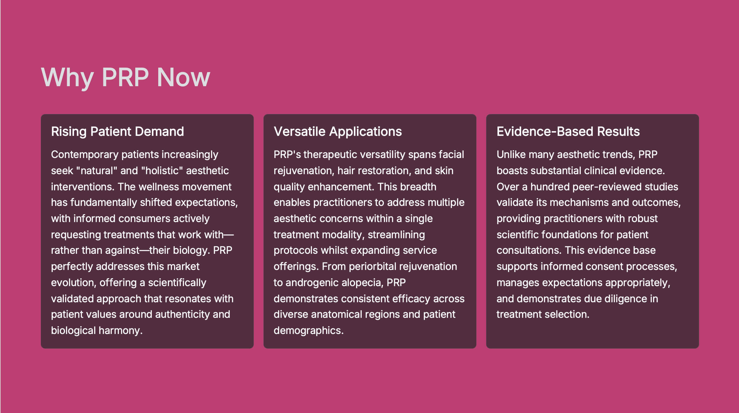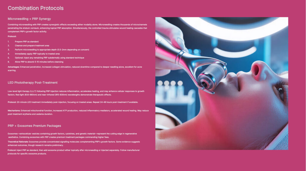 You are shown how PRP integrates into an aesthetic practice not as a “trend,” but as a diversification strategy — widening your patient base to include those seeking natural, autologous treatments while creating predictable multi-session engagement.